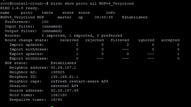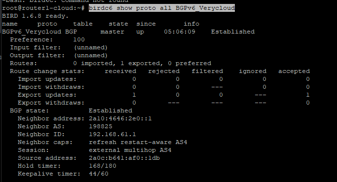 • Export updates: 1 accepted : Ton annonce de préfixe IPv6 a bien été envoyée et acceptée par le voisin.